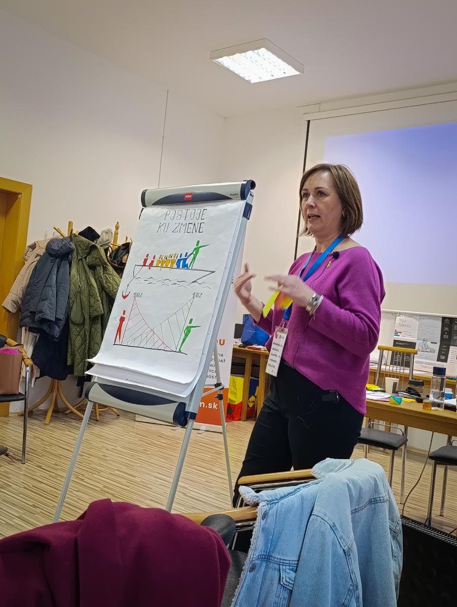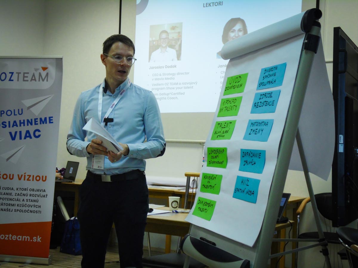 Spôsob, ako s týmito informáciami pracovať v rámci spolupracujúcej skupiny, sme potom objavovali na workshope s Jarom Dodokom, koučom silných stránok certifikovaný Gallup® a Janou Bernaťákovou z Inštitútu zmeny. Dôležitým na tejto akcii bolo pre nás nielen stretnutie s pedagógmi z iných škôl v pôsobnosti BBSK, ale hlavne pomenovanie problémov, ktoré môžu nastať pri zavádzaní zmien. Uvedomili sme si, že empatia, jasná komunikácia a podporné vedenie vedia vybudovať dôveryhodné prostredie. Minimalizáciou nepohodlia sa ľudia viac otvoria a môžeme sa dozvedieť dôvody, prečo sa niekto zmene bráni a čo môžeme urobiť s využitím našich talentov, aby sme odpor zmiernili. Lebo ako sme sa dozvedeli, „rezistencia nie je prekážka, ale spätná väzba“, ktorá nám ukazuje, čo je pre ľudí dôležité.