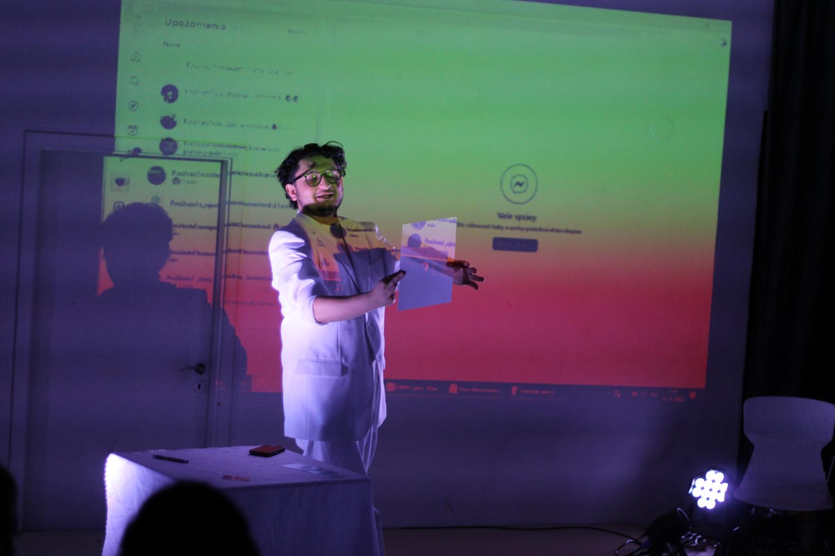 Žiaci boli počas predstavenia dobrovoľne vtiahnutí do aktivít, ktoré súviseli s pohybom na internete, špeciálne sociálnych sieťach a s výstupmi umelej inteligencie. Herec Andrej Polakovič prítomných divákov previedol ukážkami viacerých nebezpečenstiev, ktoré na užívateľov globálnych sietí číhajú. Videli sme postupy, aj možné dôsledky. Predstavenie bolo síce založené na tzv. one man show, ale postupne sme sa ocitli zapojení všetci. Vyskúšali sme si stratégie ako fishing, trolling, stalking, Modrá veľryba, deep fake... Ak neviete, o čo ide, určite by ste si mali toto edukatívne, divadelne akčné a výtvarne zaujímavé predstavenie pozrieť, aby ste „zažili silu internetu a umelej inteligencie na vlastnej koži.“