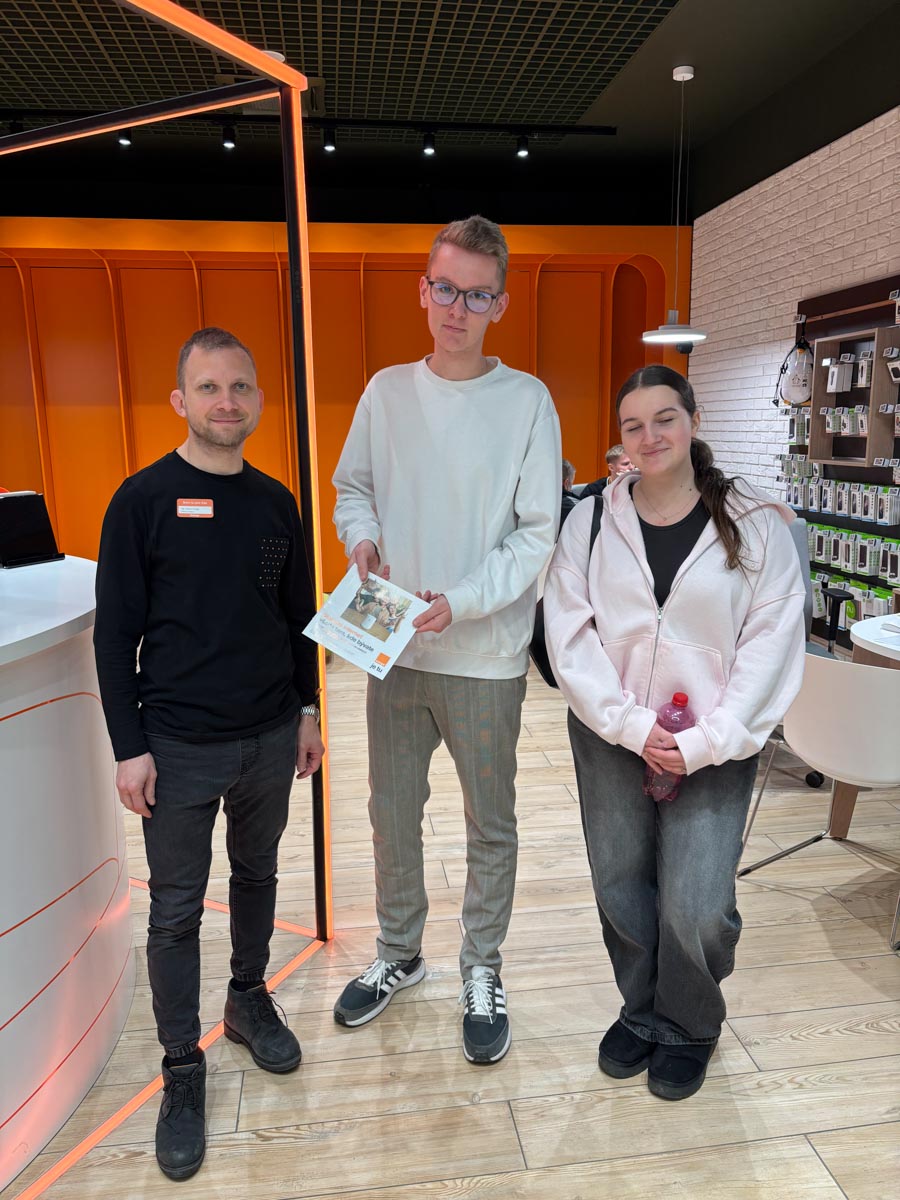 Po spoločnej fotografii sme sa presunuli do spoločnosti Telekom, kde žiaci opäť dostali informačné materiály a ochotný zamestnanec im zodpovedal všetky otázky, najmä k paušálnym a televíznym službám. V tretej zastávke – v predajni Orange Slovensko – im služby prezentoval ďalší milý a kvalifikovaný personál a aj odtiaľ si žiaci odniesli leták s podrobnými informáciami. Ostáva už len spracovať poznatky o najnovšom a jedinom slovenskom operátorovi 4ka a pustiť sa do analýzy.