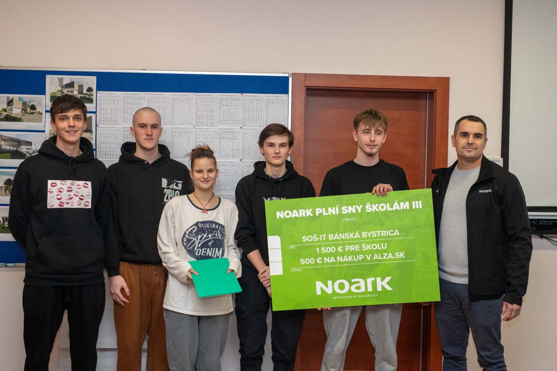 A ako sme sa k tejto súťaži dostali? Na to sme sa opýtali hlavného protagonistu, Ing. Eduarda Guzleja, majstra odborného výcviku, ktorý nám povedal: „ Dňa 23. 6. 2023 som bol na výstave Malý tvorca, ktorá sa konala v priestoroch agrokomplexu Nitra. Tejto výstavy sa zúčastnila aj spoločnosť Noark Electric Europe s. r. o., ktorá vystavovala istiace a ochranné elektrické zariadenia. Pretože vyučujem v odbore rozvody NN, vystavované produkty ma nesmierne zaujali, a preto som oslovil vystavovateľa Ondreja Nemčeka, zástupcu spoločnosti pre Slovensko. Povedal mi, že je to mladá česká spoločnosť so sídlom v Prahe, ukázal mi produkty, ktoré ponúkajú na trh a informoval ma, že ich spoločnosť organizovala súťaž pre školy NOARK PLNÍ SNY ŠKOLÁM a že aj školskom roku 2023/24 plánujú ďalšie kolo súťaže s pôsobnosťou aj na Slovensku. Nakoniec sme si vymenili kontakty. Koncom júna prišiel od zodpovedného usporiadateľa súťaže Noark plní sny školám, Michala Žocha, pozývací e-mail riaditeľovi našej školy, kde boli uvedené podrobnosti súťaže. Samozrejme, že sme pozvanie do súťaže s radosťou prijali. A ja som bol v uvedenom projekte určený ako hlavný konzultant za školu. V septembri sme sa do projektu prihlásili. Vedeli sme, že jednou z podmienok súťaže je, že musíme použiť 50 percent zaslaných produktov spoločnosťou Noark. Keďže sme nevedeli, aké produkty obdržíme, nemohli sme si naplánovať projekt, ale už sme mali zostavený „Noark Team“, ktorý tvorili žiaci maturitného ročníka IV.C, študijného odboru technik informačných a telekomunikačných technológií. Začiatkom októbra sme obdržali potvrdzujúci e-mail, že sme boli úspešne zaradení do súťaže a zoznam produktov, ktoré nám budú zaslané. V zapätí sme uvedené produkty aj dostali. Nastala otázka, aký projekt zostaviť. S kolegom Jánom Kasanom sme po krátkom zvážení, nakoľko bolo teplé a suché leto, dospeli k záveru, že by bolo vhodné urobiť projekt automatického zavlažovania. Na základe zaslaných produktov sme zhodnotili, aké komponenty nám chýbajú a tie sme objednali. Noark Team dostal za úlohu navrhnúť elektrické zapojenie na spúšťanie čerpadla v dvoch okruhoch. V prvom okruhu spúšťanie na základe elektrických časových hodín a druhom okruhu manuálne spustenie pomocou časového relé s možnosťou manuálneho vypnutia. Projekt mal byť predvedený, plne funkčný a natočený na video do 20. novembra 2023. Času nebolo veľa, a tak sme nečakali, kým nám prídu objednané komponenty a žiaci začali s konštrukciou riadiacej jednotky. Objednané komponenty nám prišli 13. novembra, týždeň pred ukončením projektu. Žiaci skompletizovali projekt a odskúšali ho. Po skompletizovaní bol projekt plne funkčný. 14. novembra sme natočili video, kde sa predviedla funkčnosť, vysvetlil sa systém a projekt bol predvedený. Už 18. novembra bolo video zostrihané a zaslané spoločnosti podľa podmienok súťaže na poslednú chvíľu. Dňa 21. novembra už boli videá súťažiacich tímov zverejnené na stránke spoločnosti Noark a bolo spustené verejné hlasovanie. Na Slovensku sa do tejto súťaže zapojilo 8 škôl, medzi ktorými sa hlasovalo. Do hlasovania sa zapojili nielen žiaci, ale aj rodičia, kamaráti, pedagógovia a aj vedenie školy na čele s riaditeľom školy, ktorý hneď každé ráno hlasoval a kontroloval priebeh hlasovania. Verejné hlasovanie bolo ukončené polnocou 21. decembra, kde naša škola skončila s druhým najvyšším počtom hlasov, a tak sa dostala medzi päť škôl, ktoré postúpili do druhého - finálového kola hodnotenia. V tomto kole traja vybraní zamestnanci spoločnosti Noark hodnotili kreatívne riešenie, viditeľnosti produktu, popis projektu a natočenie videa samotného. Táto porota päť súťažných projektov ohodnotila a tri najlepšie boli ocenené sumou 1500 € pre školu a 500 € poukážkou pre žiakov školy. Spoločnosť Noark dňa 16. januára 2024 vyhlásila výsledky hodnotenia projektov. S úžasom a potešením sme prijali skutočnosť, že náš projekt bol ohodnotený komisiou spoločnosti najvyšším počtom bodov a to 128 bodmi, čím sme obsadili prvé miesto v súťaži NOARK PLNÍ SNY ŠKOLÁM!!! A dnes Ondrej Nemček slávnostne odovzdal šek v hodnote 1500 € pre školu a 500 € pre žiakov a tiež malé pozornosti od spoločnosti NOARK, čomu sme sa potešili. Teší nás aj to, že NOARK vie takýmto spôsobom podporiť školu, zaujať, motivovať a nakoniec aj oceniť žiakov.“
